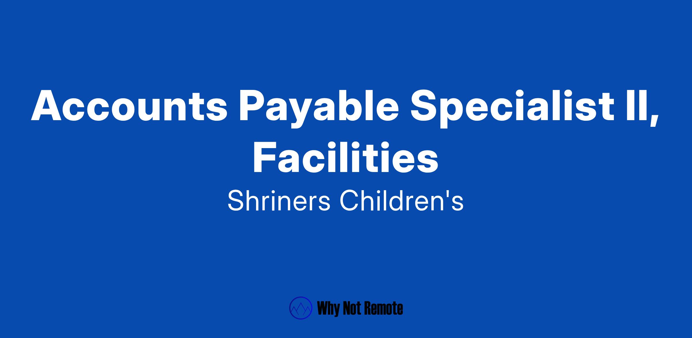 The Accounts Payable Specialist II, Facilities is responsible for processing and verifying invoices in a timely manner for our hospitals, utilizing multiple systems. The person in this role must also provide excellent customer service to vendors, employees and others in response to inquiries related to accounts payable.