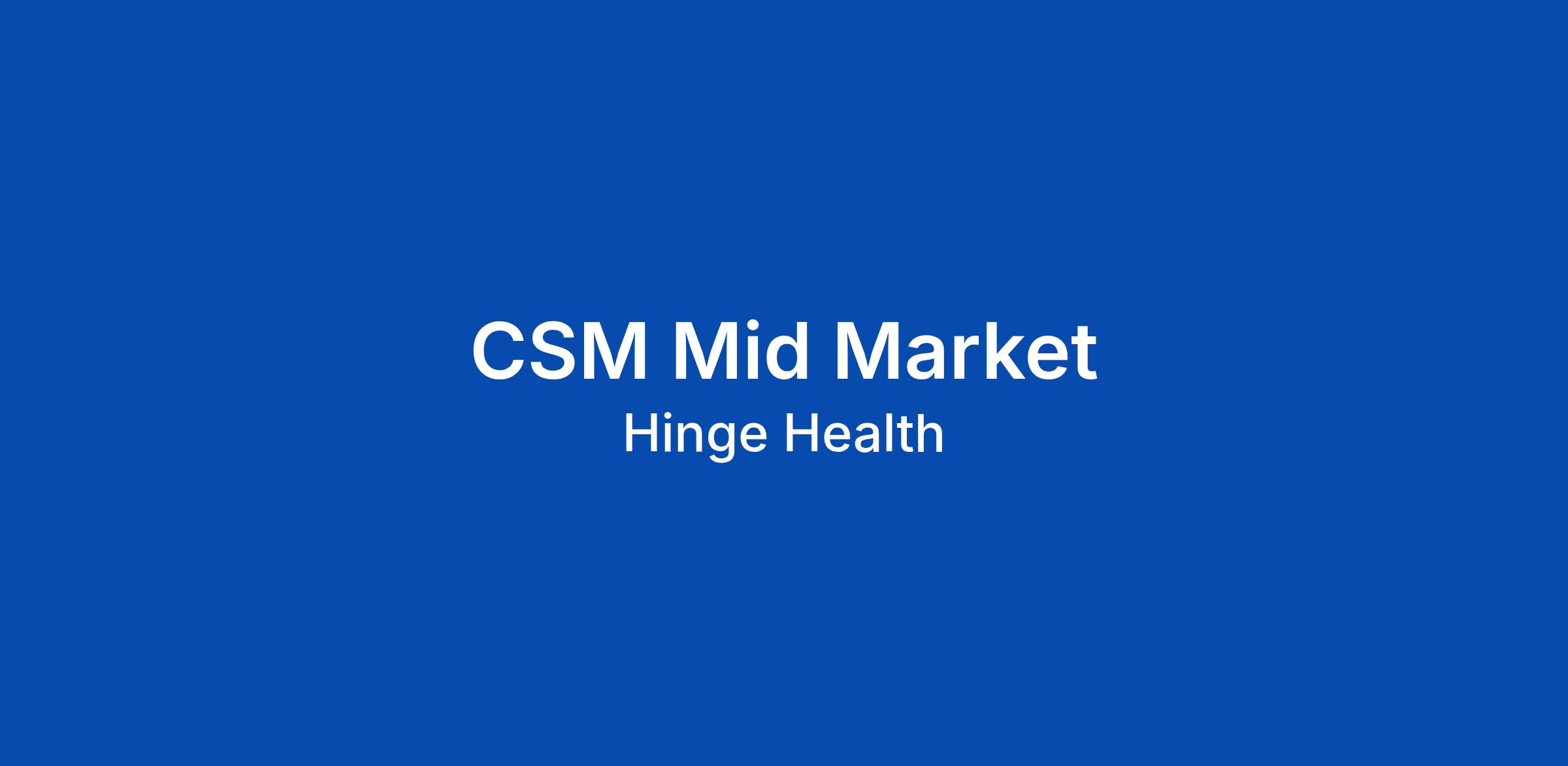 THE OPPORTUNITY Every day, millions of people struggle with musculoskeletal (MSK) pain β and Hinge Health is changing the way they access care. As a Client Success Manager β Mid Market, you'll be at the heart of that mission: owning the day-to-day relationships with our employer clients and making sure they get maximum value from the Hinge Health platform. This is a fast-paced, cross-functional role where you'll partner with Growth, Sales, Data, Marketing, Operations, Product, and Clinical teams to drive adoption, secure renewals, expand product offerings, and turn clients into long-term advocates. If you thrive as a trusted advisor who can blend strategic thinking with hands-on execution, this role is built for you. WHAT YOU'LL ACCOMPLISH In your first 3 months, you will ramp up on our product, internal tools, and client lifecycle processes. You'll build relationships with your book of Mid Market clients, complete onboarding with your team, and begin independently managing day-to-day client needs while leaning on established talk tracks and templates. In your first 6 months, you will take full ownership of your book of business and drive best-practice enrollment communications cam... Click Apply to read the full job description.