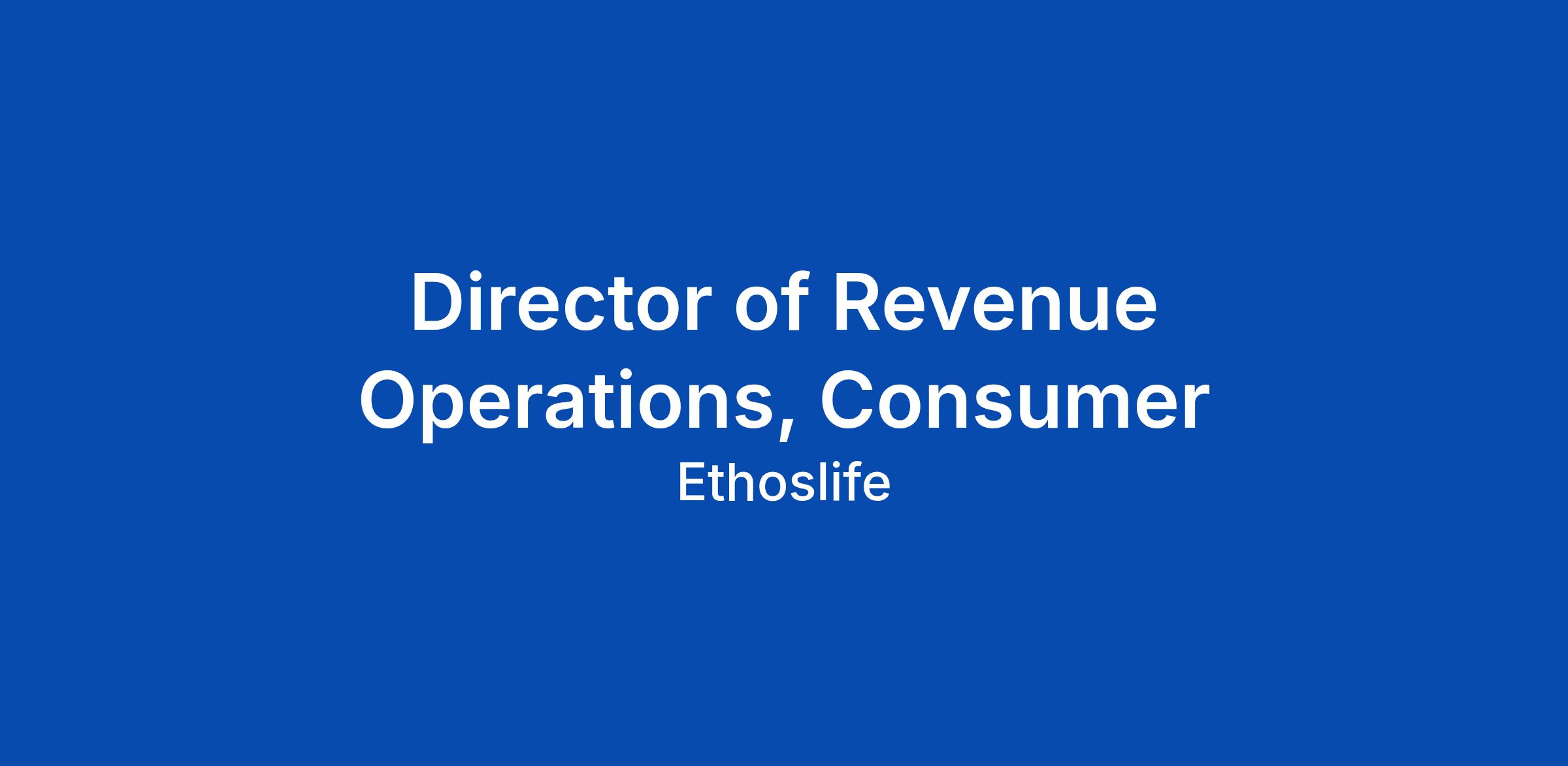 Ethos is looking for a strategic, execution-oriented leader to serve as Director of Consumer Revenue Operations. In this role, you will own the operational backbone of our B2C go-to-market teams β setting the strategic direction for how we instrument, optimize, and scale our revenue engine. You will lead a team of RevOps professionals, partner directly with Sales, CX, Produ... Click Apply to read the full job description.