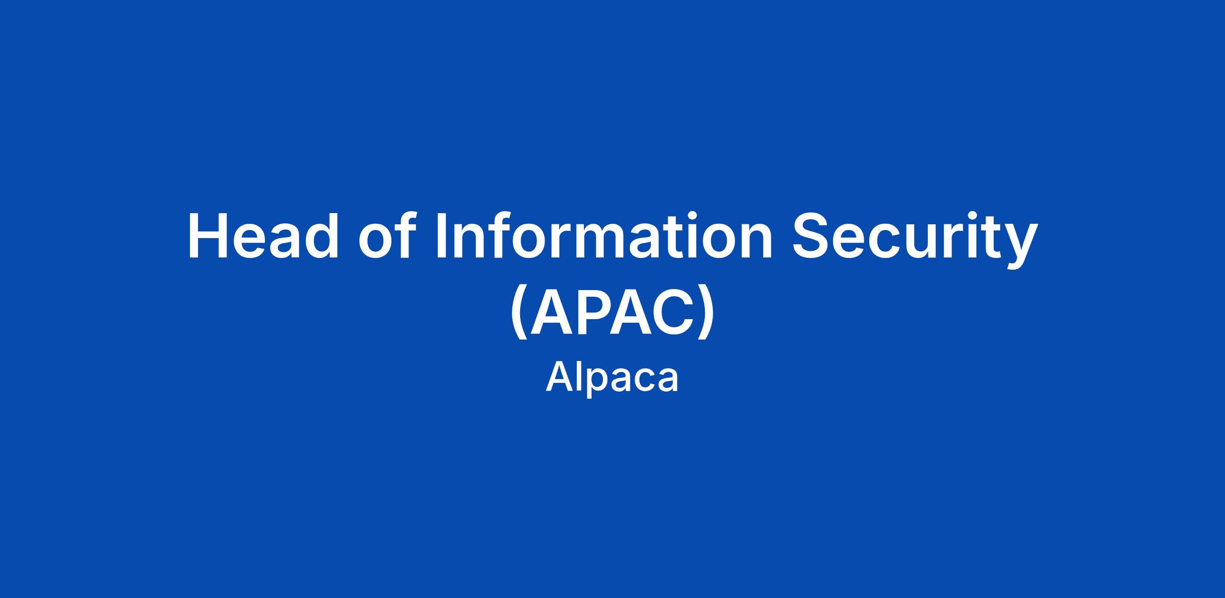 Reporting to the Global CISO, the Head of Information Security (APAC) drives Alpaca's regional security, risk, and compliance, focusing on APAC regulations (APPI, FSA, MAS).