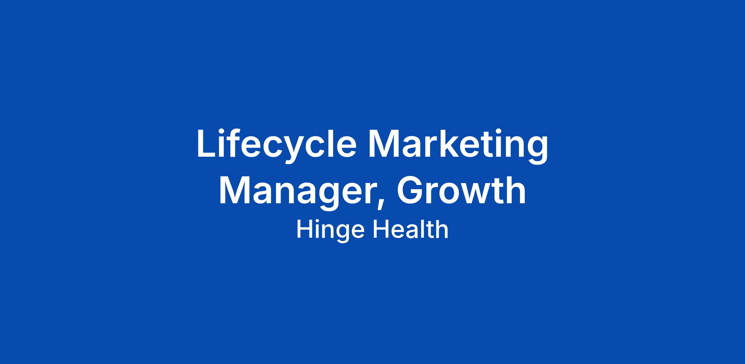 ABOUT THE ROLE: Hinge Health is looking for a Growth Marketing Manager who will lead initiatives that drive member engagement through lifecycle marketing campaigns and serve as a consumer product marketer for new programs and products. This is a hybrid role where you'll spend your time designing and running multi-channel campaigns (email, SMS, push, direct mail) that keep members active and engaged, while also partnering with product teams to bring new offerings to market with compelling messaging and go-to-market strategies. You'll work closely with our clinical team (the physical therapists, coaches, and care managers who work directly with members) to ensure marketing and clinical touchpoints work together to drive better member outcomes. You'll also partner with data science, creative, and product teams to design experiments, build personalized experiences, and measure what's working. At Hinge Health, we're building AI into everything we do. In this role, you'll be on the forefront of AI in marketing, using AI tools to accelerate your work and partnering with our AI and product teams to develop smarter, more personalized member communications. We're looking for someone who is a... Click Apply to read the full job description.