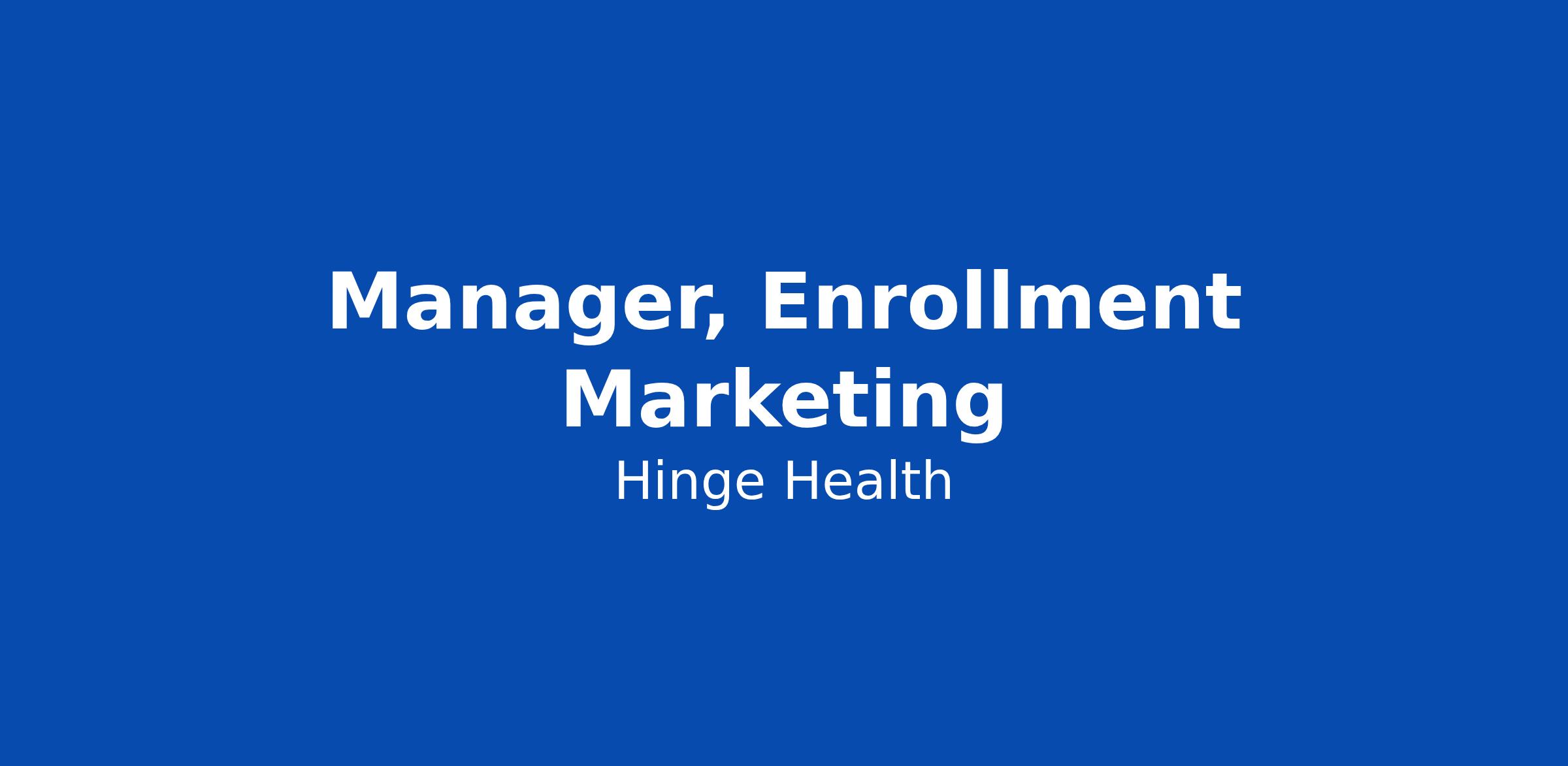 ABOUT THE ROLE We are seeking a highly skilled Manager, Enrollment Marketing to join our Growth Marketing team at Hinge Health. In this role, you will support our Growth department by balancing leadership with hands-on strategy, managing a team of direct reports while also overseeing a personal book of business of high-priority clients. As a strategic marketer, you will handle complex client requirements, serve as the client-facing marketing expert for your accounts, and act as a subject matter expert within the Enrollment Marketing (EM) team. This position is crucial in helping us drive marketing efficiency and mentor team members, contributing to the overall success of the company. You will report to the Senior Director, Enrollment Marketing and work closely with cross-functional teams, including Client Success Managers, Acquisition Marketing, B2B Sales teams and others. This role requires a strong balance of strategic planning, marketing operational execution, and people leadership in a fast-paced, highly cross-functional environment. WHAT YOU'LL ACCOMPLISH Team Leadership & Development: - Manage, train, and mentor a team of 2β5 direct reports, providing ongoing guidance to supp