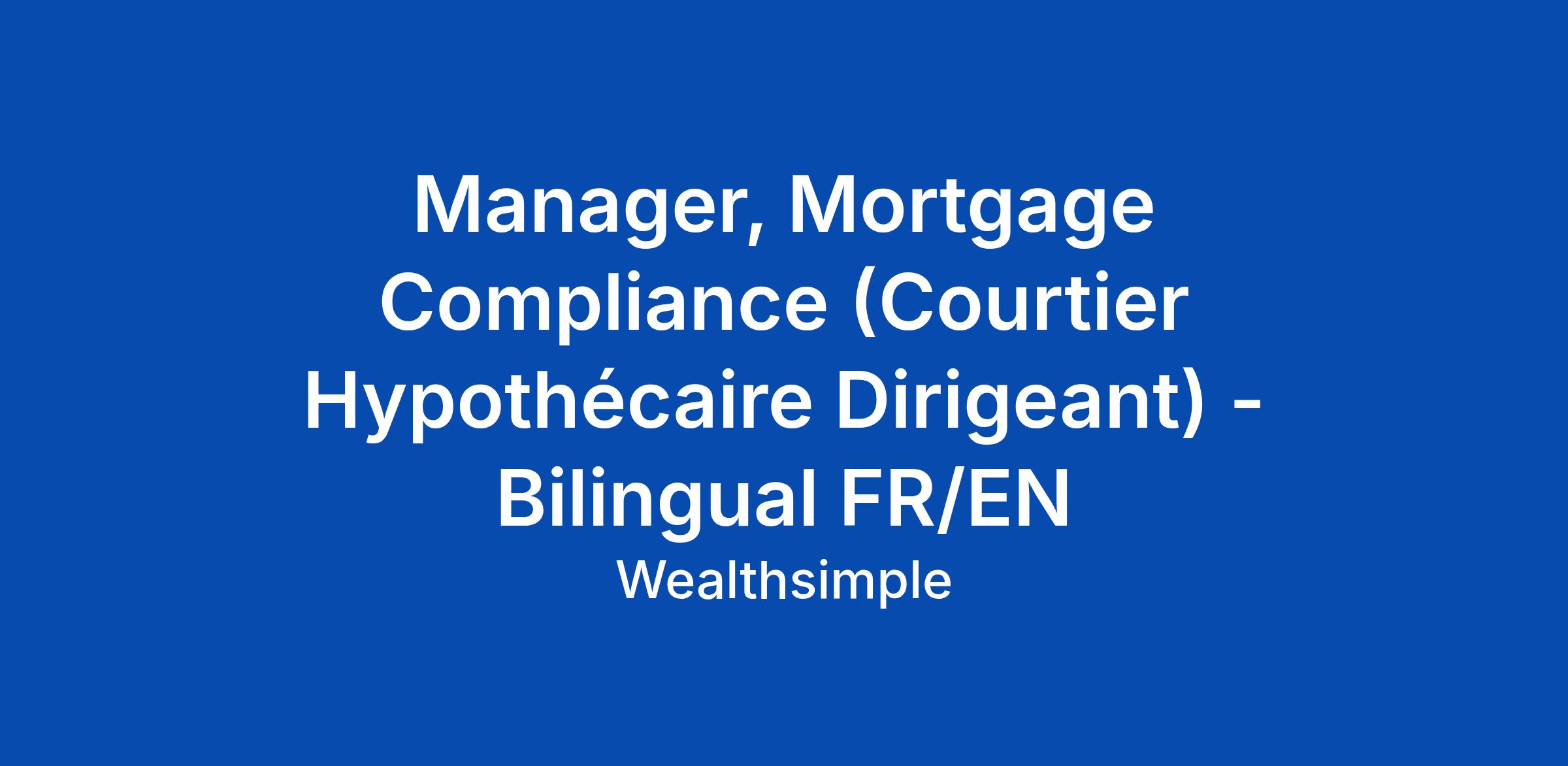 BUILD SOMETHING PEOPLE LOVE Wealthsimple's mission is to help everyone achieve financial freedom – by making financial services simple, transparent, and low-cost. We're Canada's largest fintech, trusted by over 3 million clients with more than $100 billion in assets. We move fast, we own our work, and we care deeply about the people using our products. If that sounds like you, keep reading. We're proud of what we've built — and we're just getting started. Read our Culture Manual https://www.wealthsimple.com/en-ca/culture and learn more about how we work https://www.wealthsimple.com/en-ca/careers. ABOUT THE ROLE Wealthsimple is looking for a bilingual, regulation-savvy, and entrepreneurial mortgage professional. Reporting to the Director, Principal Mortgage Broker, you'll serve as our designated Courtier hypothécaire dirigeant under the AMF — owning the licensing of our brokerage in Quebec and building the foundation for our presence in the province. This is a ground-floor opportunity to shape what Wealthsimple Mortgages looks, with significant room to grow with the role. Beyond Quebec, you'll support the Director, Principal Mortgage Broker on licensing activities across Canada — he... Click Apply to read the full job description.