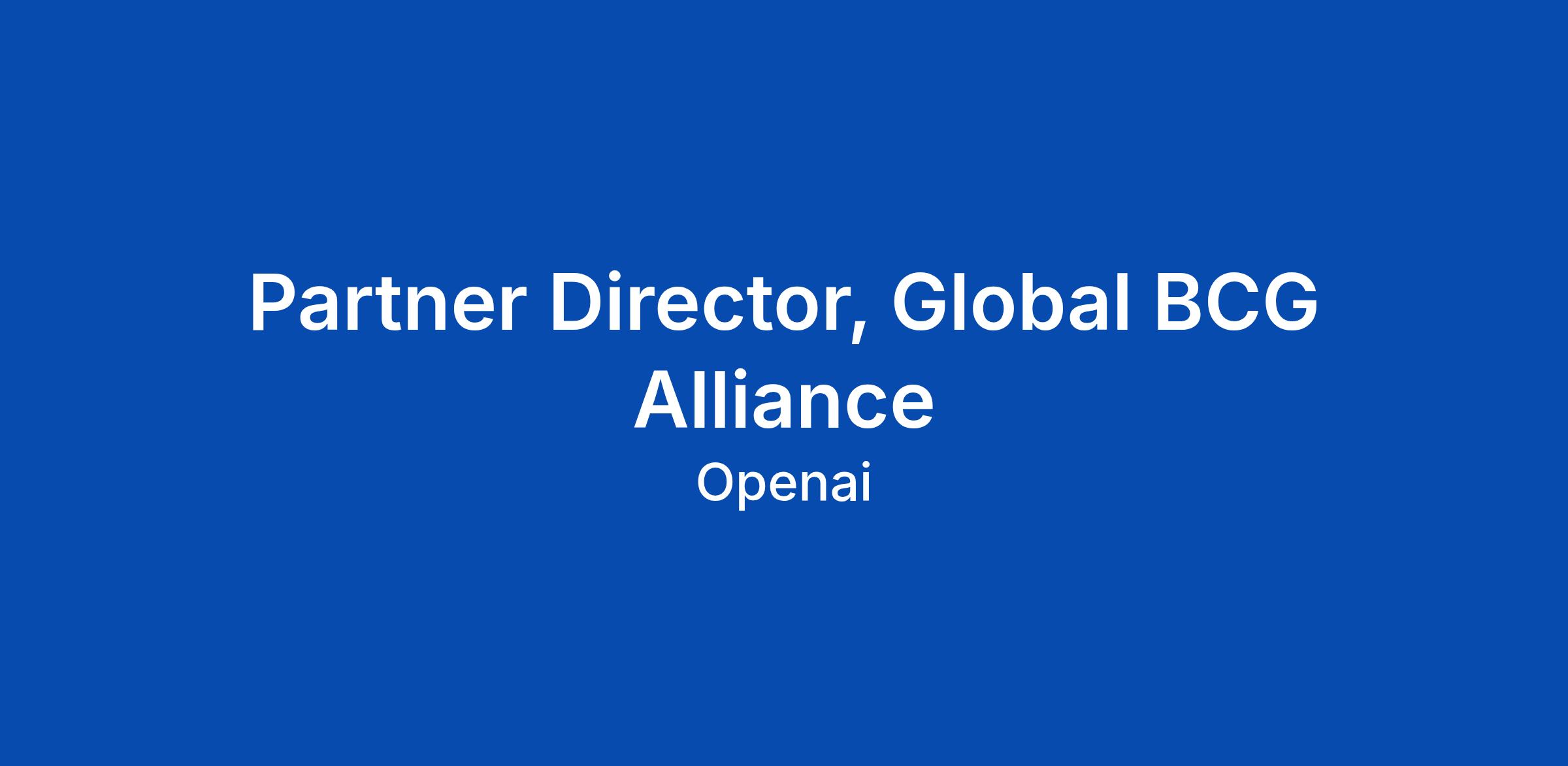ABOUT THE TEAM OpenAIβs GTM Partnerships team builds a strategic, global partner ecosystem designed to accelerate customer success, enable enterprise AI adoption, and drive durable growth in support of OpenAIβs mission toward AGI. We work closely across product, research, sales, legal, and communications teams to ensure a cohesive strategy and disciplined execution with our most strategic partners. ABOUT THE ROLE We are hiring a Global Partner Director, BCG Alliance to lead and scale OpenAIβs relationship with Boston Consulting Group. This role serves as the single accountable executive owner of the BCG relationship globally. You will be responsible for defining strategic direction, establishing a durable operating model, and converting alignment into scaled commercial and transformational outcomes across regions and industries. The role carries full responsibility for the health, performance, and long-term expansion of the partnership and requires senior executive presence, judgment, and accountability. IN THIS ROLE, YOU WILL: - Own the global BCG relationship, including pipeline growth, enterprise impact, and long-term expansion across priority industries. - Define and run OpenAI