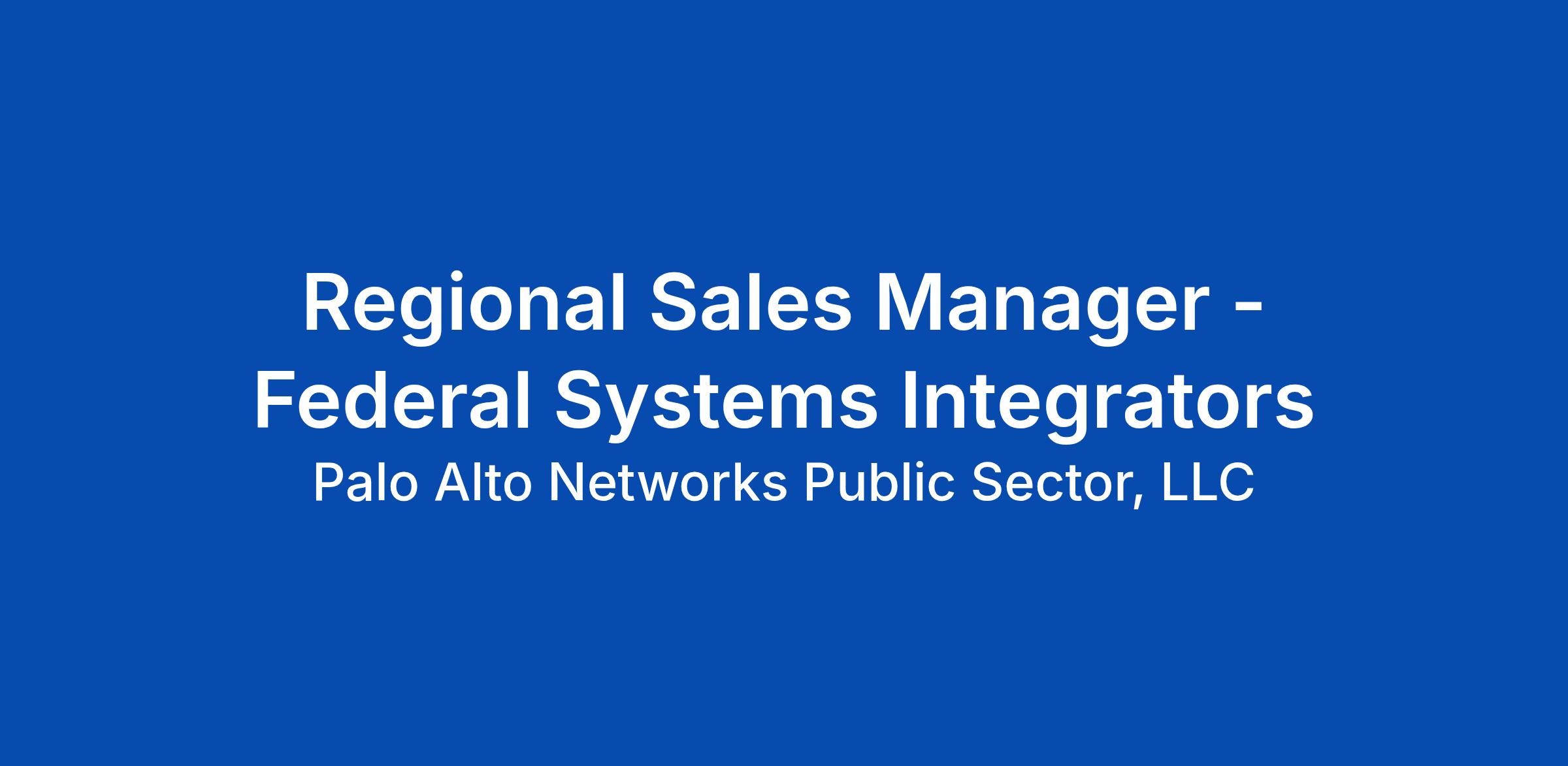 Your Career The Regional Sales Manager, Federal System Integrators is a significant driver of company revenue and growth. As an experienced and dynamic sales professional, you’re responsible for leading and driving sales engagements. You’re motivated by the desire to solve critical challenges facing our customer’s secure environment, so you’re prepared to connect them with a solution for every stage of threat prevention. You’ll be responsible for meeting and exceeding your quota by crafting and implementing strategic territory plans targeting deployments of the Palo Alto Networks Next Generation Security Platform. This is a unique opportunity for a closer with a go-getter mentality to win business and market share by actively displacing competing technologies. Your Impact As a Regional Sales Manager, FSI, you will drive and orchestrate complex sales cycles and work with our internal partners and teams to best serve the customer Bring your experience and consultative selling skills to initiate long-standing relationships with prospective customers and executive sponsors Your focus will be to create and implement strategic account plans focused on attaining enterprise-wide deployments Understanding of the strategic competitive landscape and customer needs so you can effectively position Palo Alto Networks Engage a programmatic approach to demand to generate, develop, and expand your territory Leverage prospect stories to create a compelling value proposition with insights into value for that specific account Stay updated on industry news and trends, and how they affect Palo Alto Networks products and services Travel as necessary within your territory, and to company-wide meetingQualifications