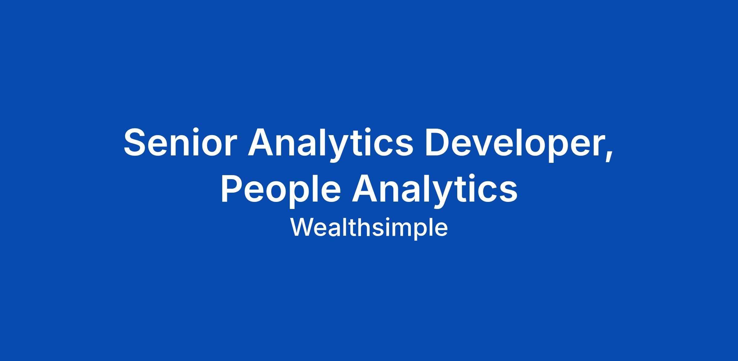 BUILD SOMETHING PEOPLE LOVE Wealthsimple's mission is to help everyone achieve financial freedom β by making financial services simple, transparent, and low-cost. We're Canada's largest fintech, trusted by over 3 million clients with more than $100 billion in assets. We move fast, we own our work, and we care deeply about the people using our products. If that sounds like you, keep reading. We're proud of what we've built β and we're just getting started. Read our Culture Manual https://www.wealthsimple.com/en-ca/culture and learn more about how we work https://www.wealthsimple.com/en-ca/careers. The People Analytics team is a new function. We're standing up the analytical foundation from scratch, and are looking for a Senior level Analytics Developer to join the team to build out this function. You'll be the first members of the People Analytics team, which means you're not inheriting a system: you're designing one. You'll build the pipelines, data models, and quality frameworks that turn raw data into the analytics foundation the business needs. This is a 0-to-1 role that calls for someone who's comfortable with ambiguity, energized by ownership, and serious about doing foundatio... Click Apply to read the full job description.