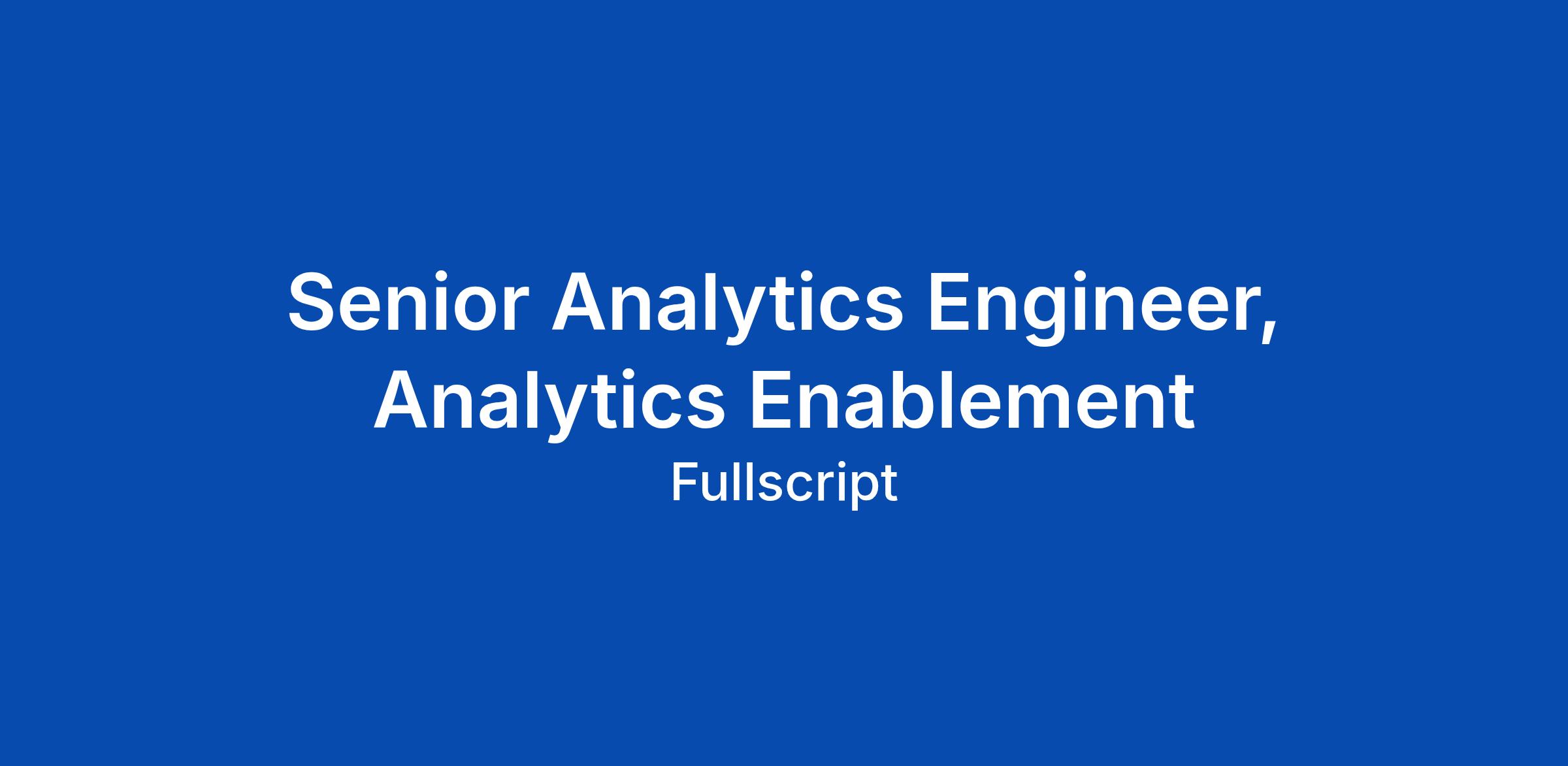 About Fullscript Weβre an industry-leading health technology company on a mission to help people get better. We started in 2011 with one simple idea. Make it easier for practitioners to access the products they trust so they can deliver better care. That simple idea grew into a platform that powers every part of care. Today, more than 125,000 practitioners use Fullscript for clinical insights, lab interpretations, patient analytics, education, and access to high-quality supplements. Over 10 million patients rely on Fullscript to stay connected to their care plans and follow through on treatment. We build tools that make care smarter and more human. Tools that save time, simplify decisions, and help practitioners stay closely connected to the people they care for. When everything they need is in one place, they can focus on what matters most: helping people get better. This is your invitation. Bring your ideas, your grit, and your care for people. Join us and shape the future of care. The Opportunity We're hiring a Senior Analytics Engineer, Analytics Enablement to help Fullscript scale how teams access, use, and learn from data. This role is centered on a specific problem: making i... Click Apply to read the full job description.