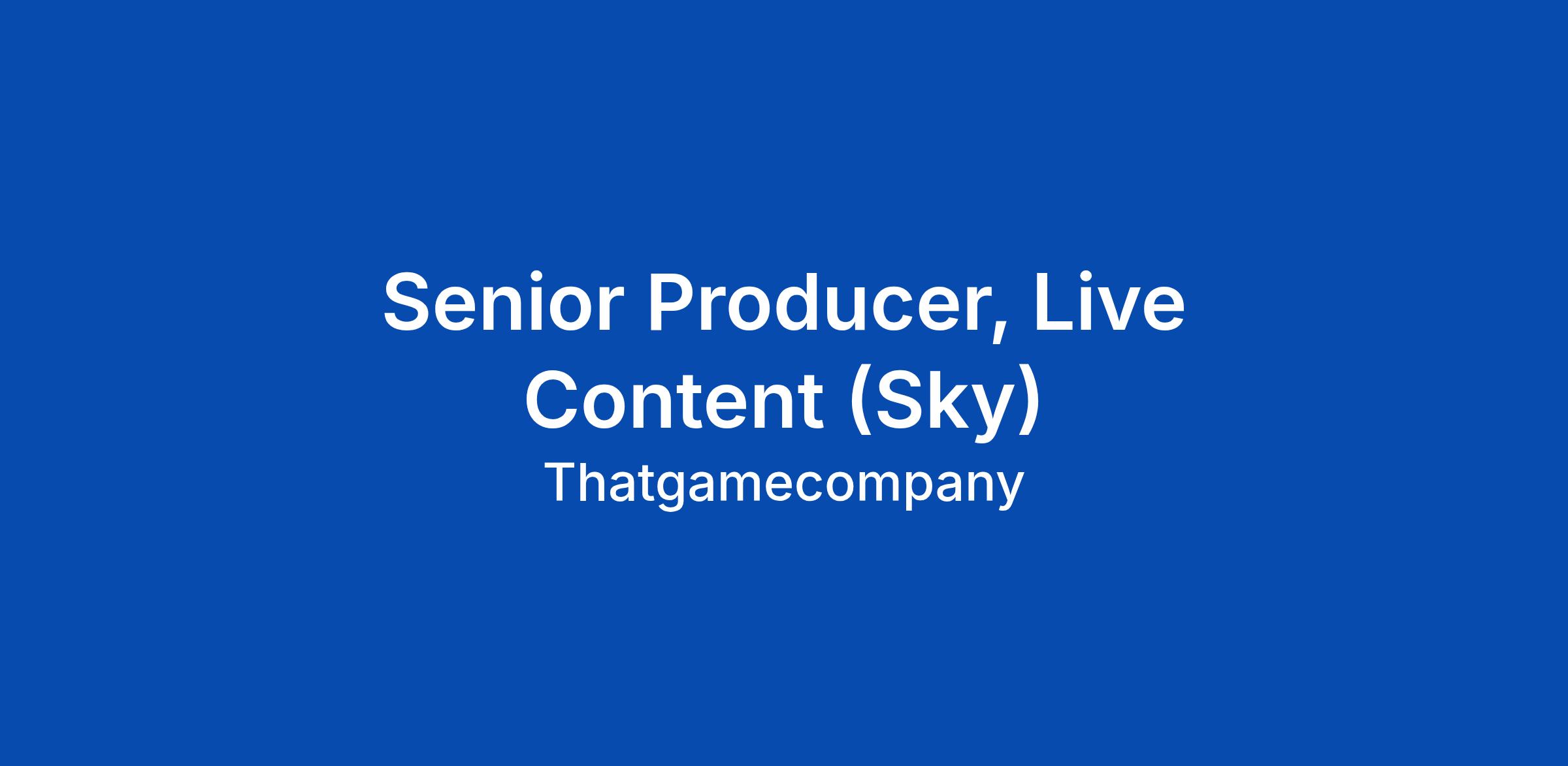 Senior Producer, Live Content (Sky) Remote US & Canada Reports to: Lead Producer thatgamecompany is looking for an experienced Senior Producer to drive the delivery of Skyβs live content and projects as part of the core production team. This role is responsible for driving execution across seasonal content, limited-time events, features, and collaborations while maintaining release stability, production clarity, and alignment with creative direction. The Senior Producer ensures content ships at a high level of quality and predictability within a fast-moving live environment. Responsibilities - Own production delivery for Sky live content initiatives across seasonal content, limited-time events, gameplay features, and content collaborations. - Drive execution from concept through release validation in partnership with design, engineering, art, QA, publishing, community, and platform stakeholders. - Partner with discipline producers to align schedules, capacity planning, and milestone commitments across departments. - Act as delivery owner for assigned projects, ensuring scope clarity, milestone readiness, and release confidence. - Identify production risks early and lead mitigation