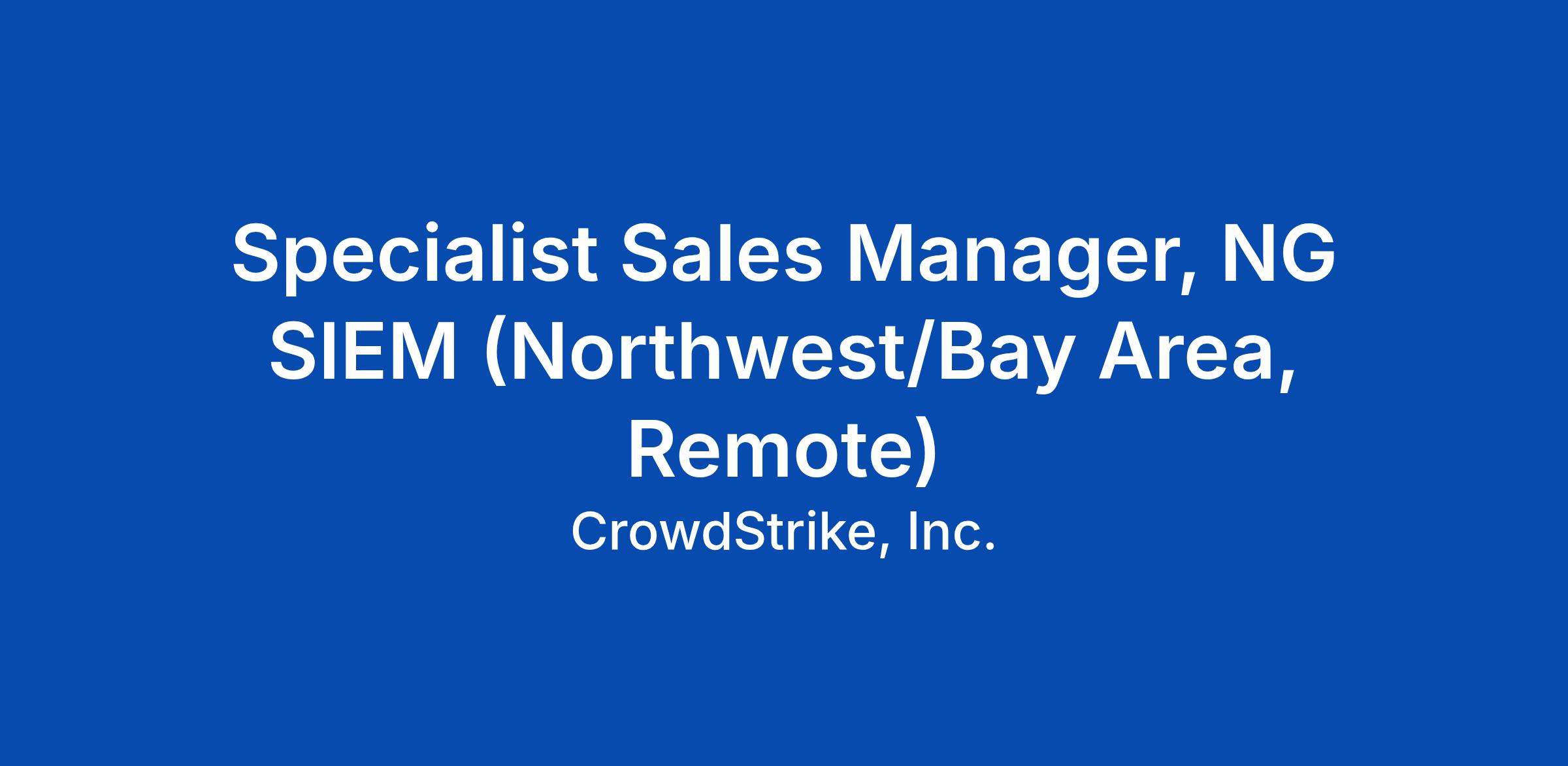 As a Specialist Sales Manager, NG SIEM, you will have the exciting opportunity to help promote the growth and shape the future of the Next-Gen SIEM and Log Management business at CrowdStrike. You will combine your relevant technology sales experience with solid industry insight to successfully position our industry-leading NG SIEM and log management platform to our top Enterprise customers– articulating and demonstrating business value/ROI. Your job is to build out your territory and maximize market adoption. In return, this position offers uncapped income potential in one of the most strategic, fastest-growing segments of the technology industry and an opportunity to join a company at the forefront of establishing de facto leadership in this market.