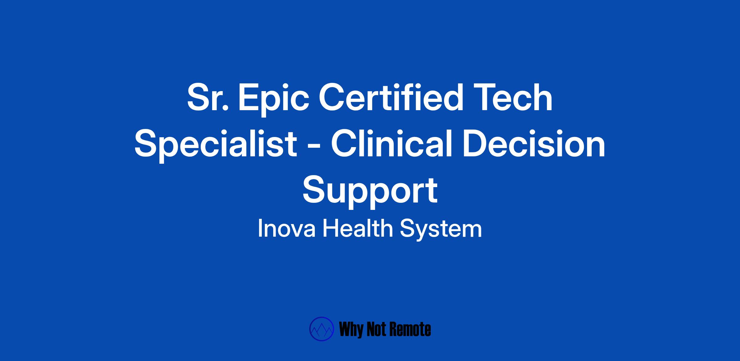 DescriptionInova IT Clinical Applications is looking for a dedicated Sr. Epic Certified Tech Specialist - Clinical Decision Support to join the Team. This remote role will be full-time day shift working Monday – Friday.