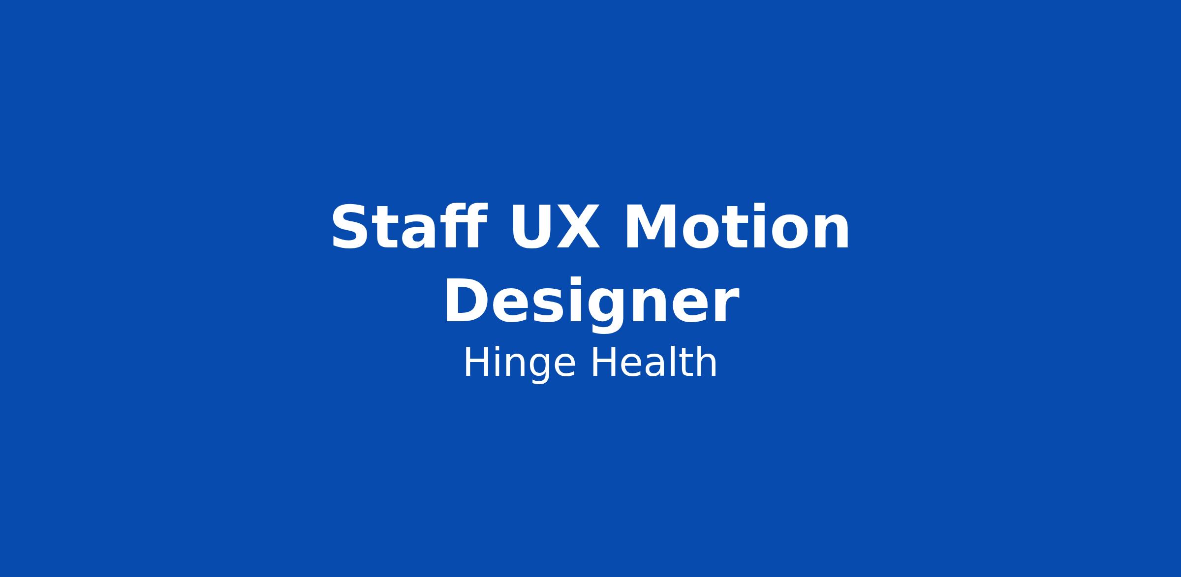 ABOUT THE ROLE Hinge Health is a company that recognizes the value of design. As a Staff UX Motion Designer, you’ll join a tight-knit, highly collaborative Product Design team focused on building cohesive, intuitive, and emotionally resonant member experiences. This is a foundational, craft-defining role. You will be the sole UX Motion Designer at Hinge Health — responsible for shaping how motion shows up across our product, from transitions and micro-interactions to system-level behaviors that communicate state, guide users, and build trust. You’ll work deeply embedded with product designers, engineers, and cross-functional partners, bringing motion into the heart of design decision-making. This role is ideal for someone who thrives as a solo practitioner, enjoys operating with autonomy, and is motivated by building systems and standards that scale. This is a high-impact role at an especially exciting time in Hinge Health’s journey. Our team is at the center of solving impactful problems for millions of members who are managing their joint and muscle health, while making a meaningful difference in their lives. WHAT YOU'LL ACCOMPLISH - Design motion-rich interactions that improve u