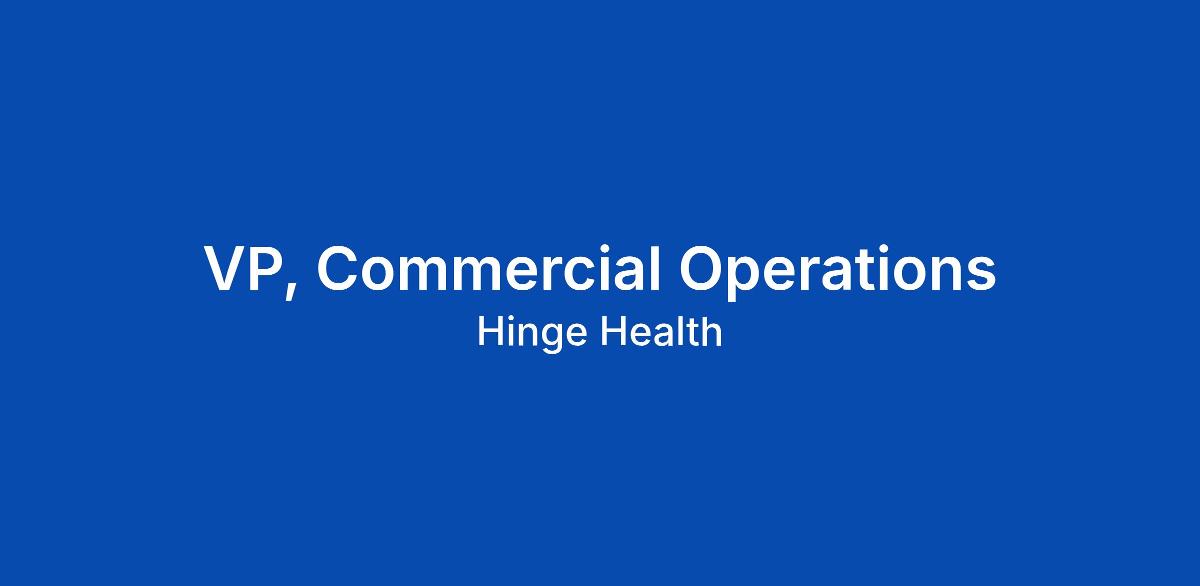 THE OPPORTUNITY Join the team transforming how millions of people access MSK care by building the engine that powers our commercial growth. We are seeking a highly skilled VP, Commercial Operations to join our Commercial leadership team at Hinge Health. In this role, you will architect and lead programs that support the company's Commercial strategy and drive operational transformation by simplifying and scaling processes and systems. You will serve as a strategic partner to the Chief Commercial Officer, ensuring our teamsβfrom Sales to Client Successβare equipped with the insights, tools, and incentives to scale beyond our next major milestones. WHAT YOUβLL ACCOMPLISH - Strategic & Operational Architecture: You will architect and lead programs that support the company's Commercial strategy, driving operational transformation by simplifying processes and systems. You will lead strategic projects, using data-driven research to forecast market trends and advise senior leadership on direction. - Commercial Engine Optimization: You will oversee and scale critical functions including Business Development Representatives (BDRs), Deal Desk, and Learning & Development (L&D), ensuring our p